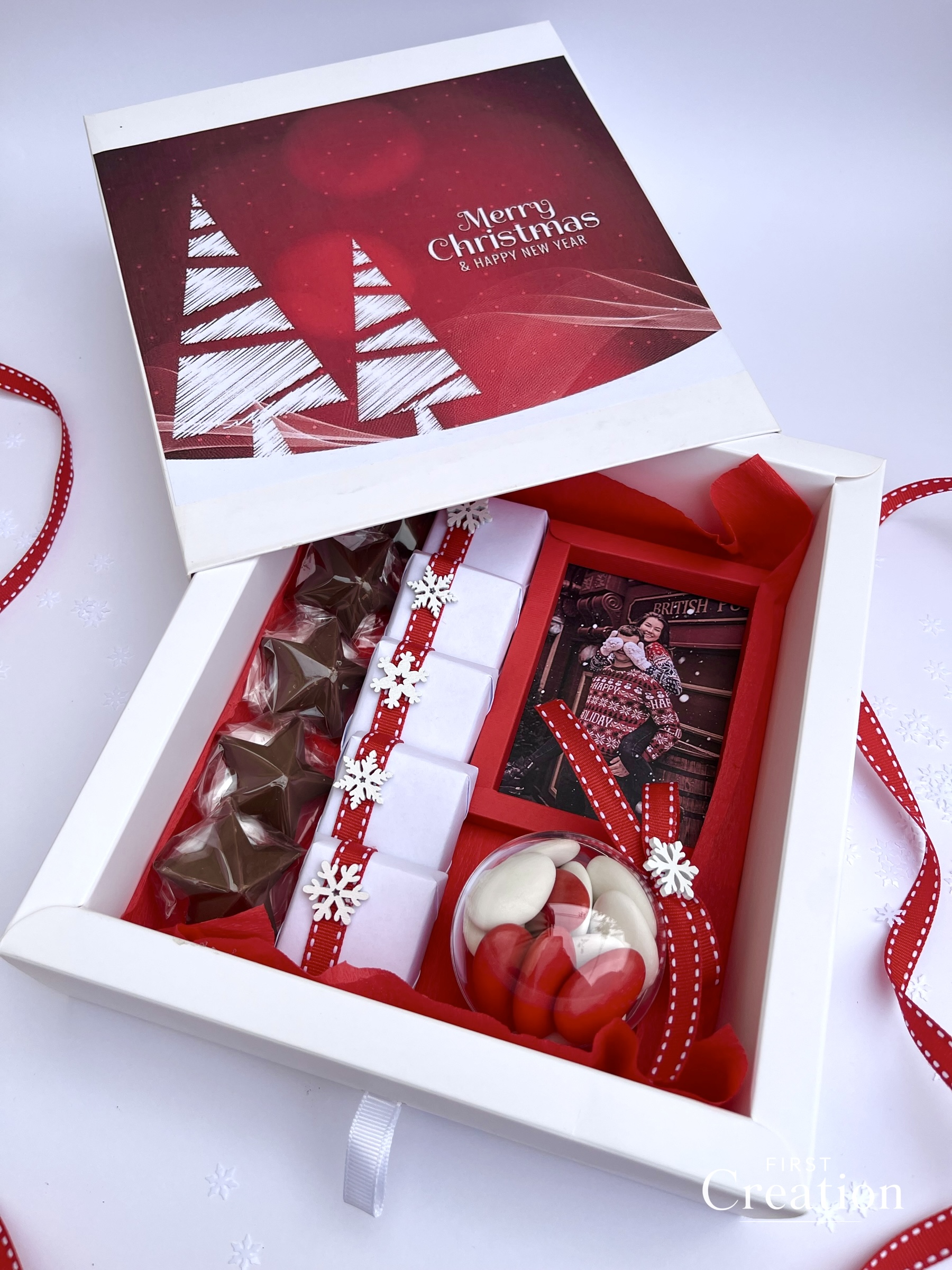 The Box includes: Hazelnut Praline chocolate stars, designed chocolates, dragées Christmas ball & handmade carton photo frame.